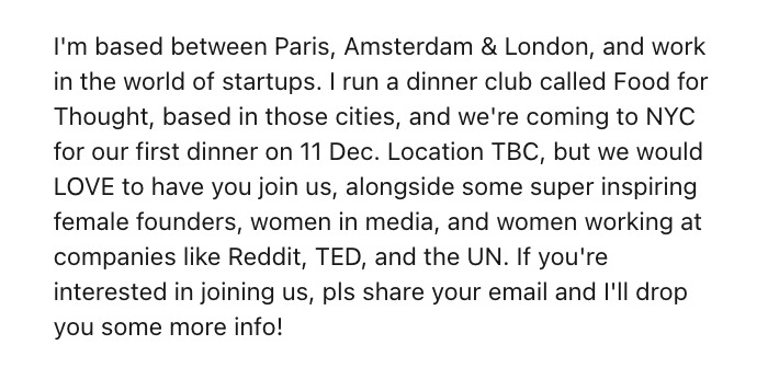Again, we got amazing feedback. It seemed like people were really craving this kind of low-key networking that didn’t feel like networking, and the chance to meet likeminded people over a casual weeknight dinner. We rinsed and repeated across New York City, Berlin, Lisbon, Paris and Sydney, and still host regular dinners to this day. I keep track of my network in a series of messy Excels, and while I don’t know exact numbers, through hosting all of these events I’ve met 100s of amazing people in cities across the world. They work in all sorts of industries, and I’ve since connected with many of them for coffees, collaborations, and paid projects.